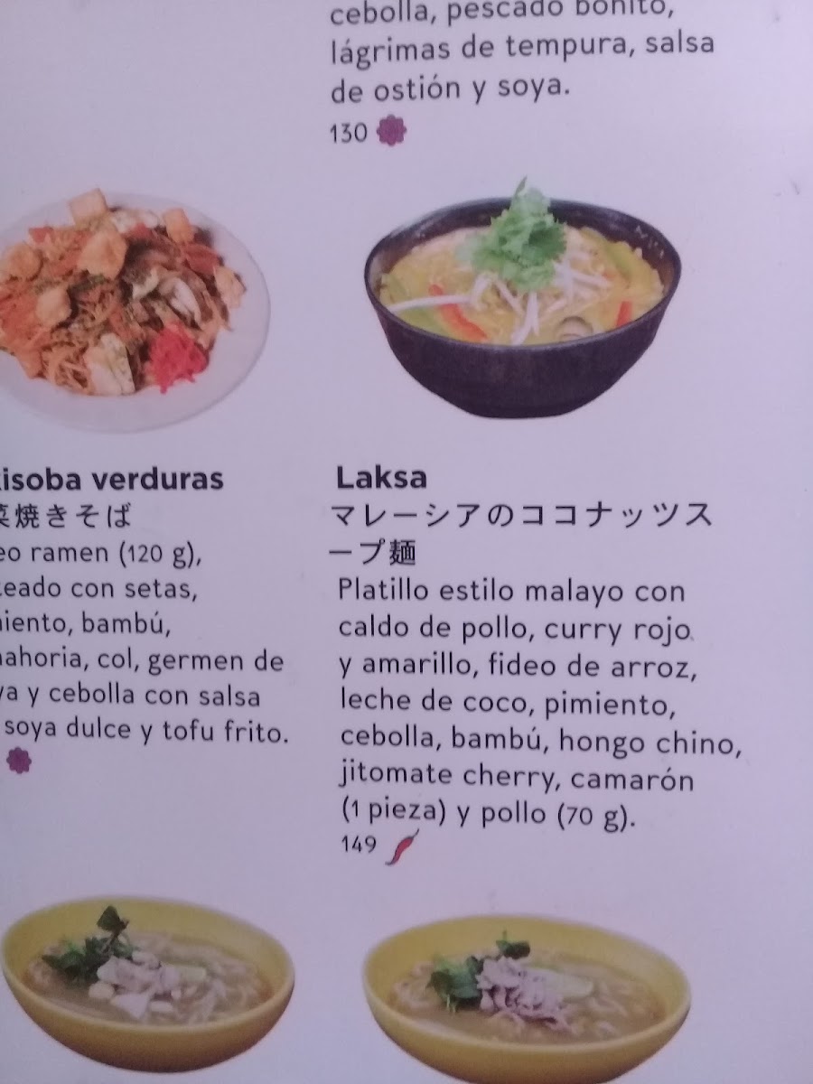 Caldo a base de camaron y pollo, acompanado de germen de soya, pimiento, hongo chino, leche de coco, bambu, cebolla, camaron (1 pieza) y hierbas aromaticas.